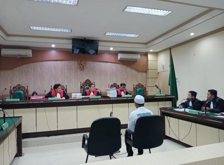Menggunakan baju tahanan bertuliskan Lapas Banjarbaru. terdakwa nampak hadir langsung di persidangan.