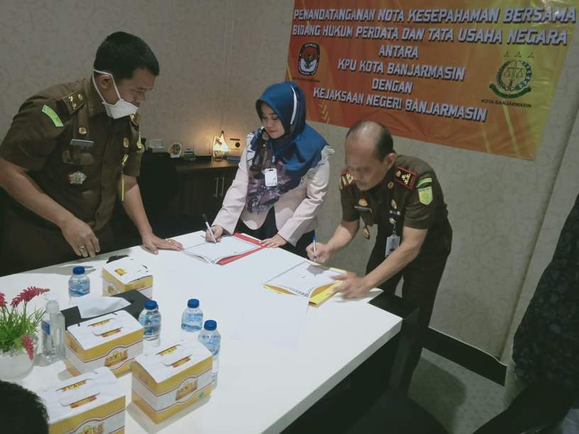 Banjarmasin, BARITO – Komisi Pemilihan Umum (KPU) Banjarmasin menandatangani kesepakatan bersama dengan Kejaksaan Negeri Banjarmasin Bidang Hukum Perdata dan Tata Usaha Negara pada Selasa (28/7).