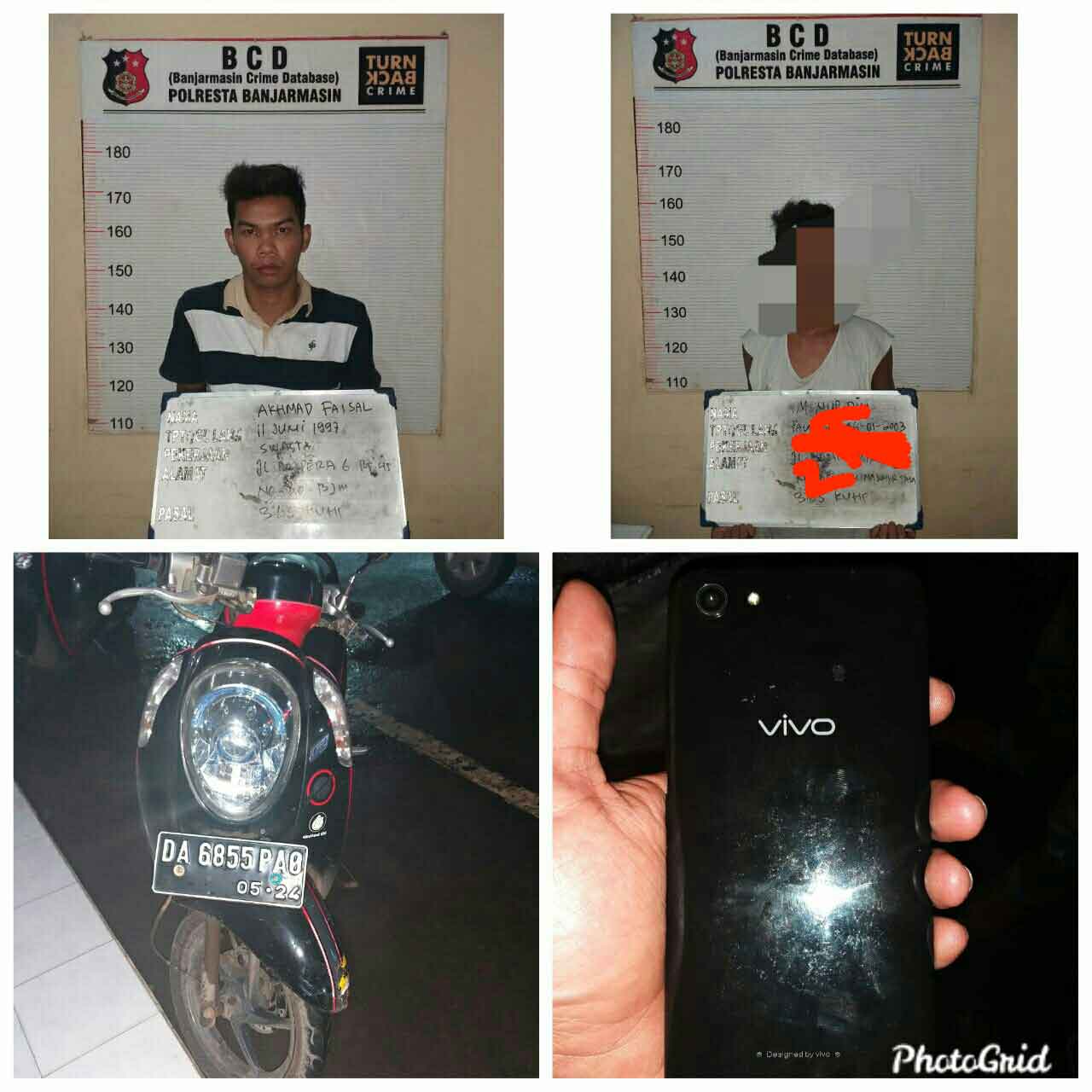 Banjarmasin, BARITO – Sungguh keterlaluan pelaku jambret  bernama Akhmad Faisal  (23) ini dalam aksinya dia melibatkan anak dibawah umur berinisial MN (15)  Kamis (3/10/2019) sore pukul  18.00 Wita lalu. Mereka merampas ponsel di Jalan  Ir PHM  Noor Samping Gang Perjuangan Kelurahan Pelambuan Kecamatan  Banjarmasin  Barat.