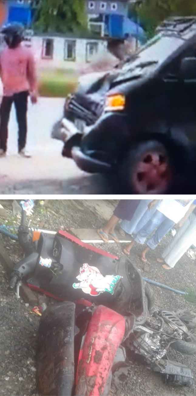 Sepeda motor matic Yamaha Lexi warna merah tanpa nomor polisi dan sebuah mobil Pick Up warna hitam DA 8318 LE terlibat hebat insiden kecelakaan tersebut.