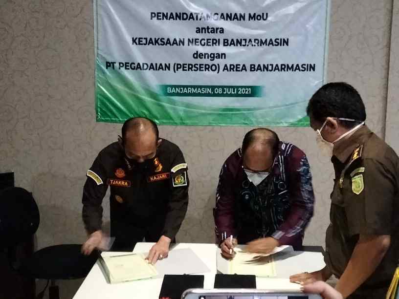 Banjarmasin, BARITO – Dengan tujuan kerjasama tata perdata dan tata negara untuk menyelamatkan aset, PT Pegadaian (persero) area Banjarmasin, Kamis (8/7) melakukan penandatangan MoU kerjasama dengan Kejari Banjarmasin.