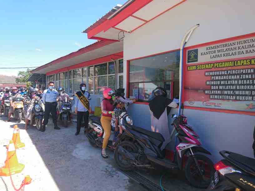 Banjarmasin, BARITO – Lembaga Pemasyarakatan (LP) kelas II A Banjarmasin menerapkan sistem Drive Thru, Senin (31/5/2021) pagi. Puluhan pengendara yang datang pun tidak langsung ke tempat parkir, melainkan menuju loket yang disediakan guna menerapkan Protokol Kesehatan (Prokes).