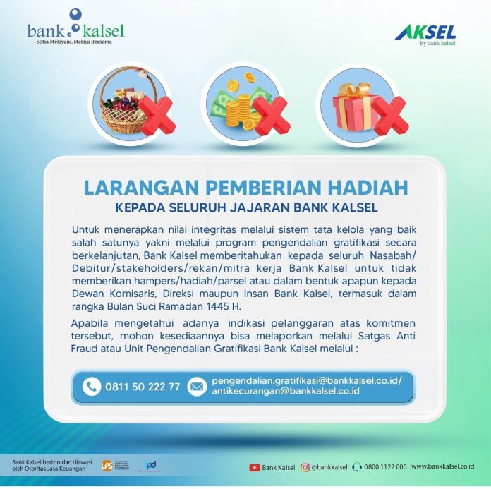 Untuk menerapkan nilai integritas melalui sistem tata kelola yang baik salah satunya yakni melalui program pengendalian gratifikasi secara berkelanjutan, Bank Kalsel memberitahukan kepada seluruh Nasabah/Debitur/stakeholders/rekan/mitra kerja Bank Kalsel untuk tidak memberikan hampers/hadiah/parsel atau dalam bentuk apapun kepada Dewan Komisaris, Direksi maupun Insan Bank Kalsel, termasuk dalam rangka Bulan Suci Ramadan 1445 H.