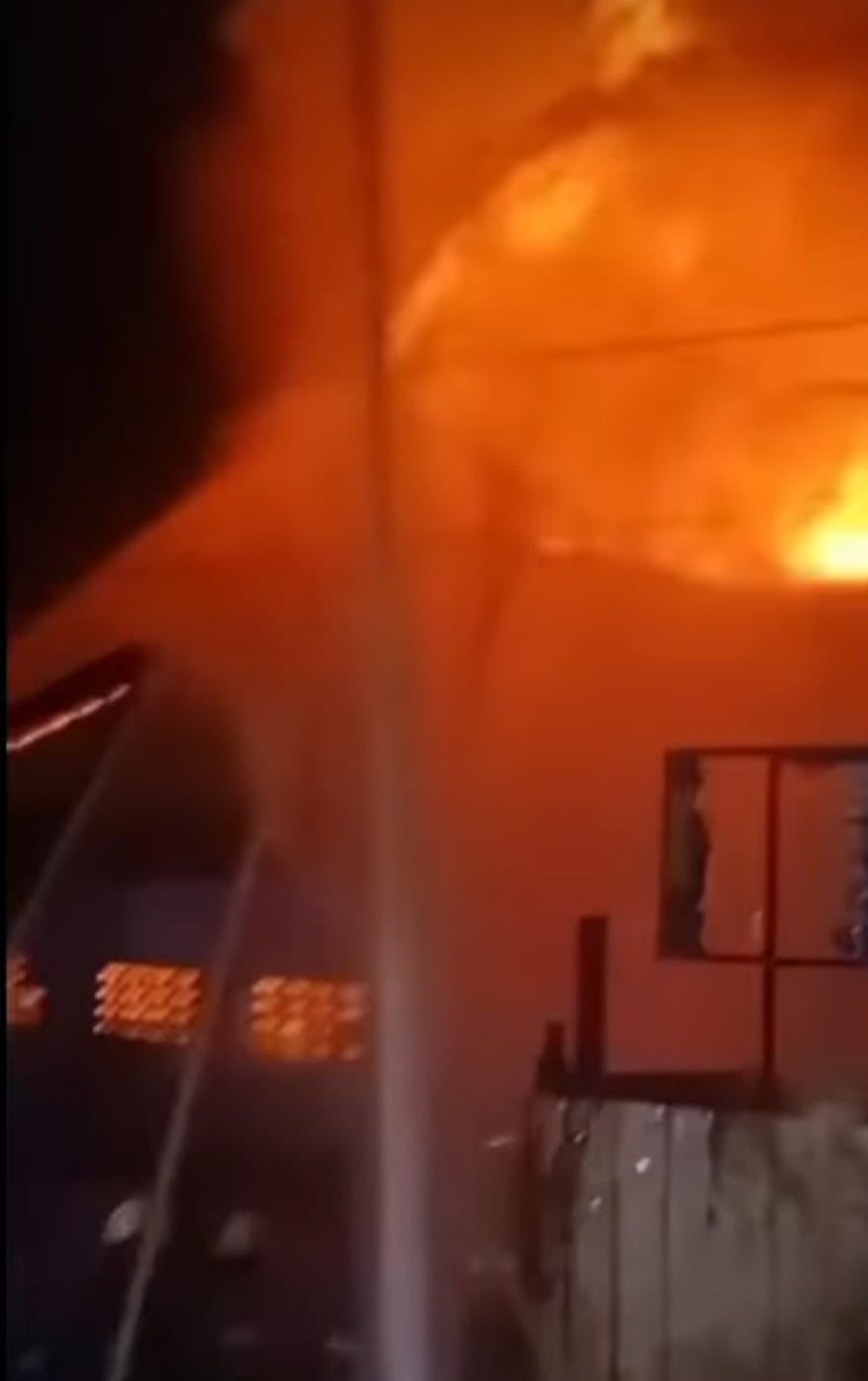 Dalam hitungan menit, api berkobar hebat dari dalam gudang, menjulang tinggi ke langit dan menerangi kawasan tersebut.