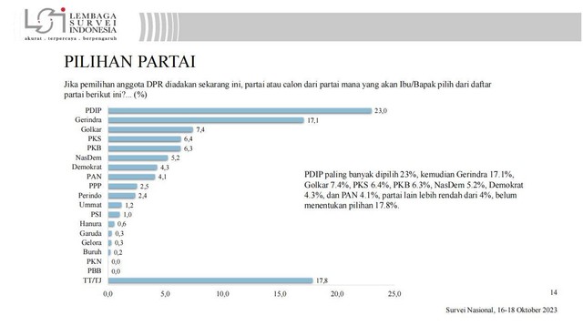 Jakarta, BARITOPOST.CO.ID – Lembaga Survei Indonesia (LSI) merilis hasil surveinya terkait pemilihan Legislatif Pemilu 2024. Survei ini digelar 16 hingga 18 Oktober 2023, seperti dilansir kumparan.com.