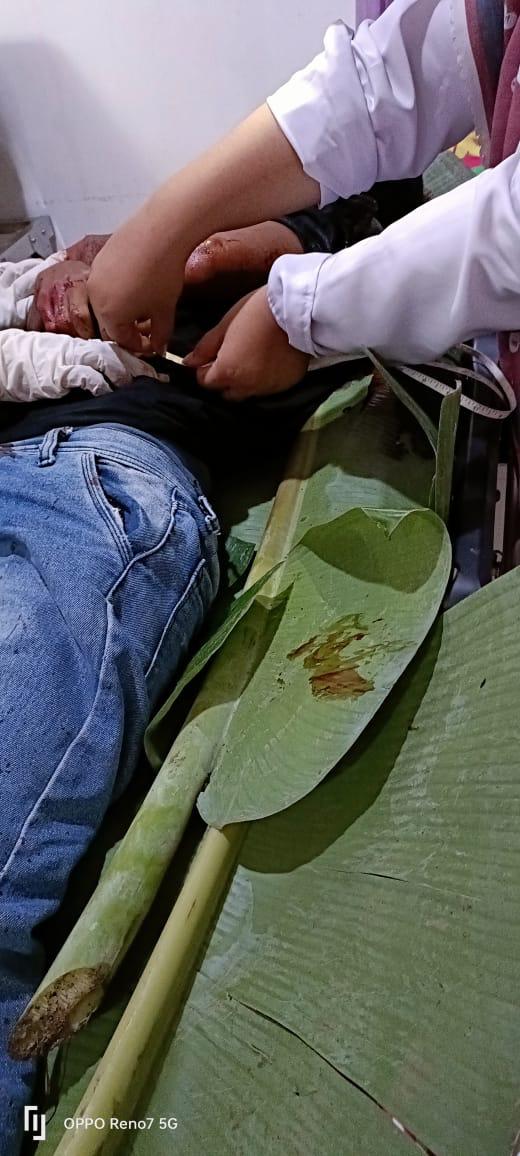 Tidak lama kemudian Aisyah menemukan korban sudah tergeletak di tempat kejadian dengan 3 mata luka bacok pada bagian leher kiri, dada dan pergelangan lengan kanan.
