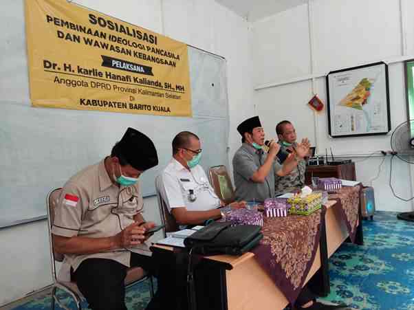 Dihadapan kepala desa se-Anjir Muara, perangkat desa dan tokoh masyarakat, Karlie Hanafi menjelaskan tentang empat pilar kebangsaan yang terdiri dari Pancasila, UUD 1945, NKRI dan Bhinneka Tunggal Ika.
