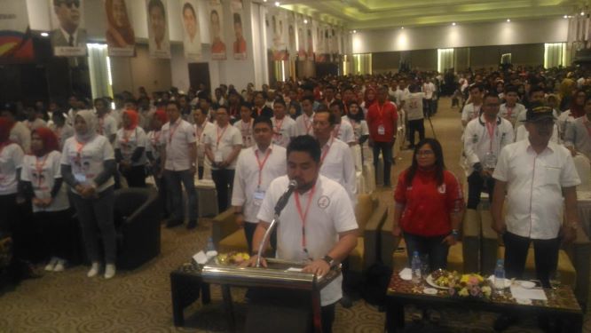 Kegiatan yang bertajuk Pemuda Banua Bersatu untuk Indonesia Maju ini dihadiri sebanyak1.200 orang pemuda dan simpatisan yang hadir memenuhi ruangan Ballroom Rattan Inn menyatakan dukungan dan siap memenangkan PDIP Kalsel dan Jokowi-Maruf, Sabtu (6/4/2019).
