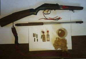 Saat petugas melakukan penggeledahan dirumah SR ditemukan 1 buah senjata api rakitan jenis senapan yang terdiri dari 1 buah laras, 1 buah popor, 1 buah baut grindel, 1 set karet pendorong, 1 buah pelatuk, 2 botol kecil minyak pelungsur, 6 buah peluru berbahan timah, bubuk mesiu dan sabut kelapa yang disimpan dibelakang lemari ruang tamu rumahnya.