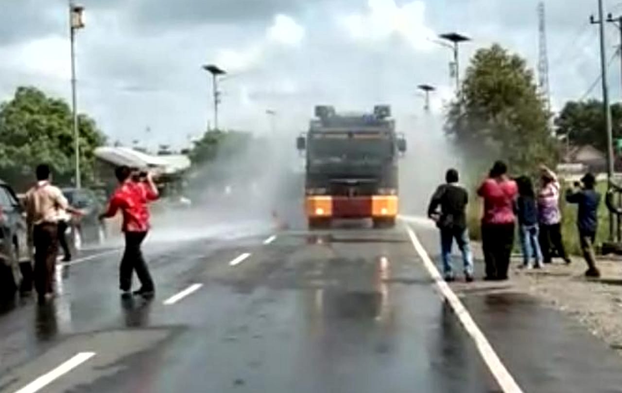 Dengan menggunakan Mobil Amour Water Canon, sepanjang jalan Trans Kalimantan di Kecamatan Anjir Muara dan Kecamatan Anjir Pasar yang menjadi lintasan kendaraan antarkedua provinsi disterilkan, dengan dilakukannya penyemprotan cairan desinfektan oleh Polres Barito Kuala, Kamis (2/4/2020)