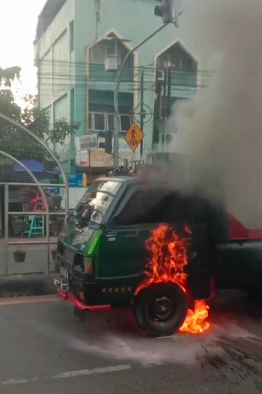 Sopir kendaraan, Muhammad alias Amat (53), langsung menyelamatkan diri dengan melompat keluar setelah melihat asap dan percikan api keluar dari bagian mesin.