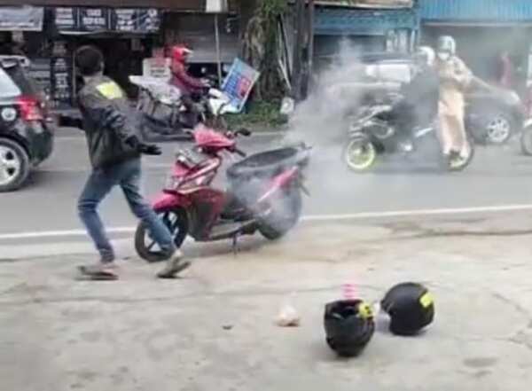 Selanjutnya tiga warga membawa air menggunakan ember menyiramkan ke motor yang diparkir di tepi jalan tersebut. Bahkan salah satu emak-emak memakai hem merah maron juga turut gerak cepat (gercep) memadamkan menggunakan ember setempat.