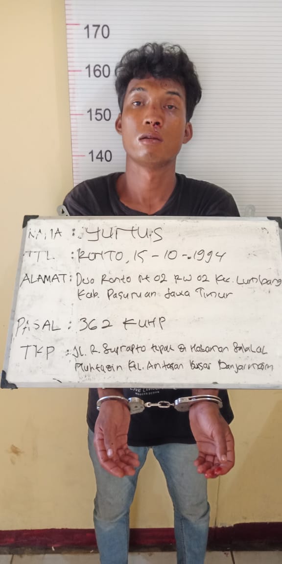 Setelah menerima laporan tersebut pihak Buser Reskrim Polsek Banteng langsung terjun ke lokasi kejadian dan menangkap pelaku bernama Yunus (25). Pengangguran itu merupakan warga Desa Kronto Rt 02 Rw 02 Kecamatan Lumbung Kabupaten Pasuruan Jawa Timur hanya bisa pasrah saat diringkus.