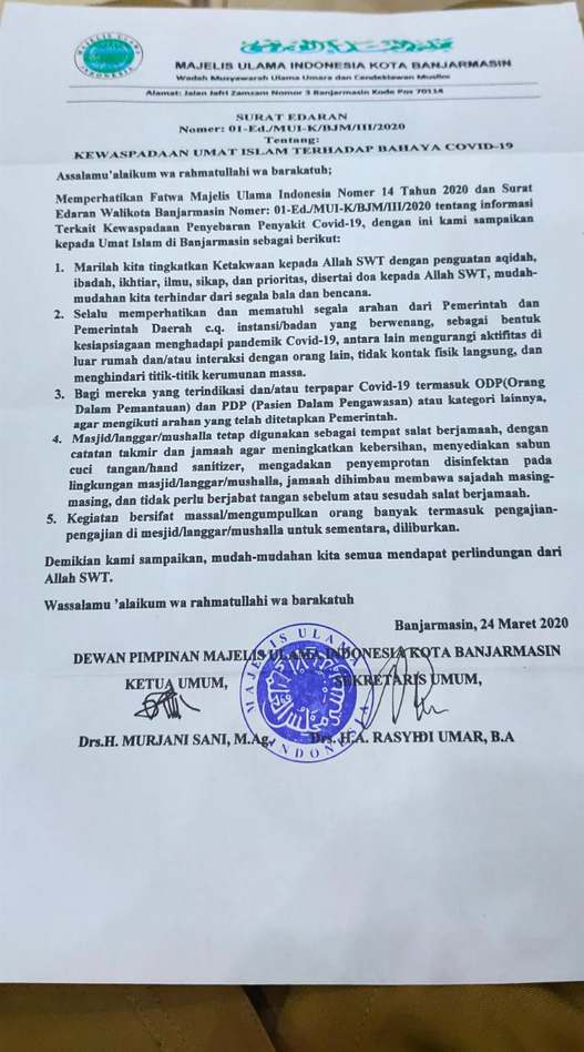 Banjarmasin, BARITO-Majelis Ulama Indonesia (MUI) Kota Banjarmasin mengeluarkan Surat Edaran Nomer: 01-Ed./MUI-K/BJM/II1/2020 Tentang Kewaspadaan Umat Islam Terhadap Rahaya Covid-19, Rabu (24/3/2020). Karena memperhatikan Fatwa Majelis Ulama Indonesia Nomer 14 Tahun 2020 dan Surat Edaran Walikota Banjarmasin Nomer: 01-Ed./MUI-K/BJM/III/2020 tentang informasiTerkait Kewaspadaan Penyebaran Virus Corona tersebut.