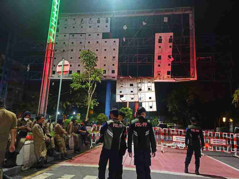 Belum lagi, eksekusi juga dilakukan tidak secara profesional. Pasalnya, pembongkaran tiang utama bando dipotong tanpa pengaman, sehingga berdampak pada jalan aspal.