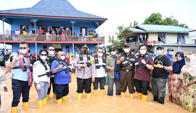 Naik Perahu Karet, Kapolda Kalsel Dampingi Komisi II DPR RI Kunjungi Lokasi Banjir di Kabupaten Banjar