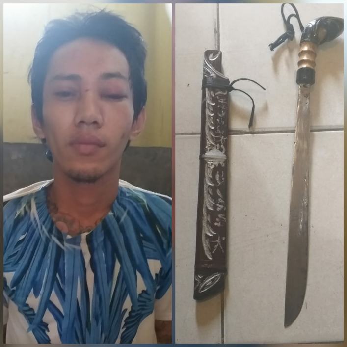 Tersangka Mas Imam alias Imas (29) ini juga membawa senjata tajam (sajam) jenis Mandau lengkap dengan sarungnya, panjang kurang lebih 45 cm. Tak ayal buruh akibat ulahnya yang bisa membahayakan, buruh itu pun dilaporkan warga .