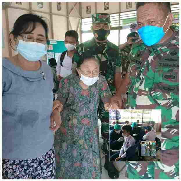 Dengan dipapah menantunya bernama Silvia (50), Oe masih bisa berjalan secara perlahan-lahan juga dibantu salah satu Babinsa bernama Erwin. “Ini vaksin kedua saya, “singkat Oe warga Pekauman belakang SMA Don Bosco. Sebelumnya ia ikut vaksin pertama di Gereja di kawasan Kelayan.