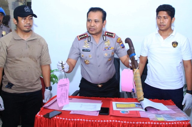 BARBUK SAJAM- Kapolresta Banjarmasin Kombes Pol Sumarto di dampangi Kasat Res Narkoba, Kompol Wahyu Hidayat dan Kasat Reskrim AKP Ade Papa Rihi saat konferensi pers memperlihatkan barbuk dua buah sajam, Kamis (10/10) siang lalu . (foto:ist)