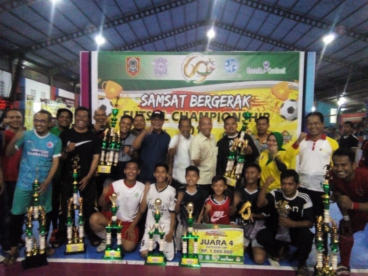 Banjarmasin, BARITO – Pertandingan final Samsat Bergerak Futsal Championship 2019 yang mempertemukan tim Tutui A (Kejaksaan) melawan Tutui B (Polsek Banteng) berakhir yang dimenangkan Tim Tutui B. Tim yang dilatih Aiptu Togap itu dinobatkan sebagai juara pertama dan berhak menerima uang pembinaan Rp5 Juta dalam kategori instansi, Rabu (14/8) malam.