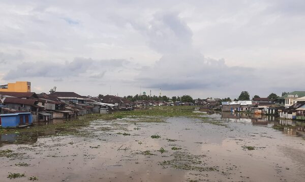 Fenomena pampangan itu telah menumpuk di bawah Jembatan Pasar Lama. Akibatnya, arus lalu lalang transportasi sungai menjadi terganggu.