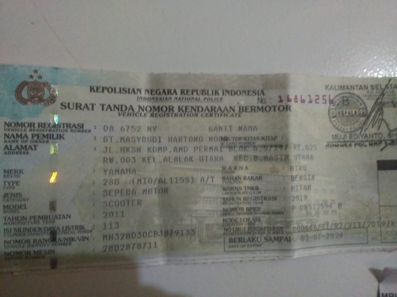 Banjarmasin, BARITO – Gusti Masyrudy Hartono (55) kesal dengan ulah pencuri kendaraan bermotor (curanmor) miliknya jenis Yamaha Mio warna biru No DA 6752 NY tahun 2011, Minggu (8/9/2019) dinihari pukul 01.30 Wita.