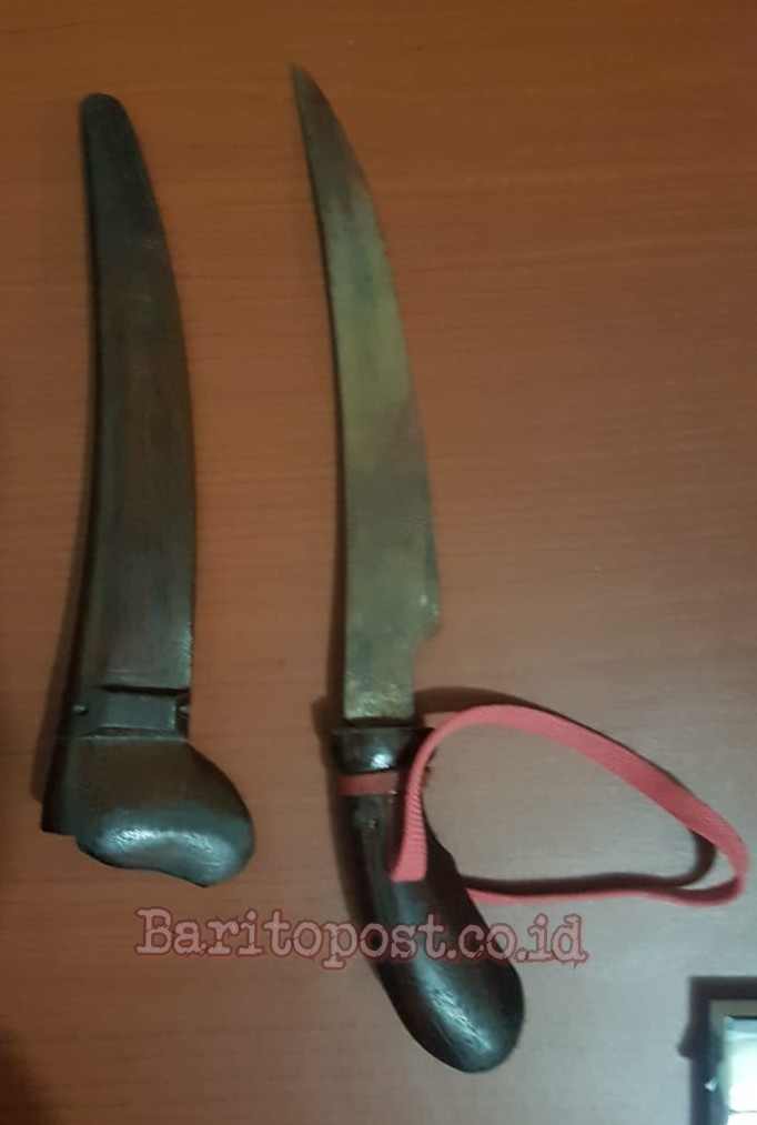 Dari tangan pelaku disita 1 bilah pisau beserta kumpangnya warna coklat dengan panjang kurang lebih 35 cm.