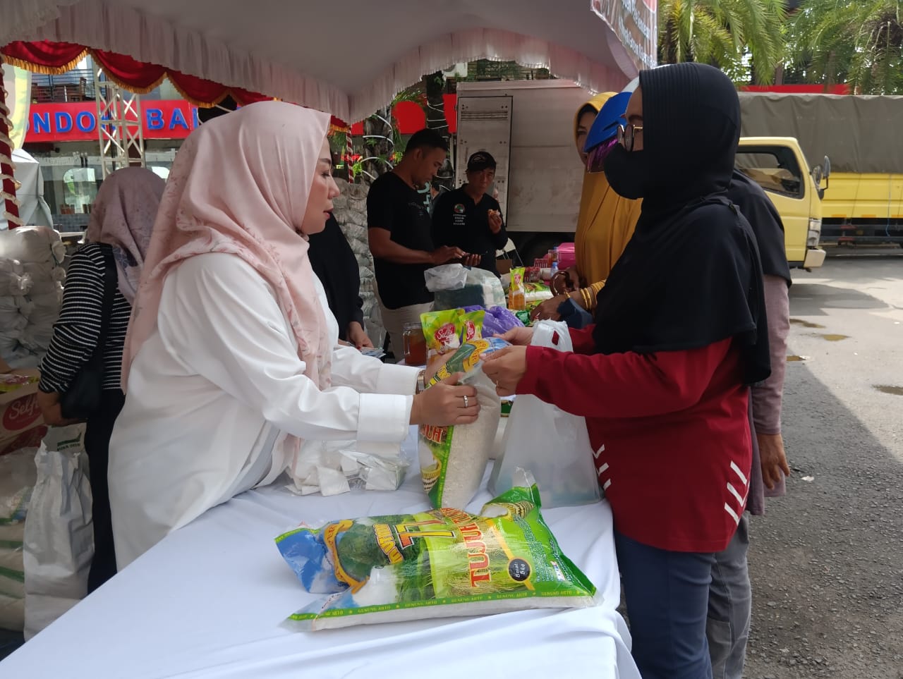 Khusus di Taher Square ini, Aida mengaku menyiapkan 5000 kilogram gula pasir, 5000 liter minyak goreng dan 5000 sak beras kemasan. “Untuk Gula kami berikan subsidi sehingga harganya dari Rp18 rb perkilogram menjadi Rp15.500 saja,” tambahnya.