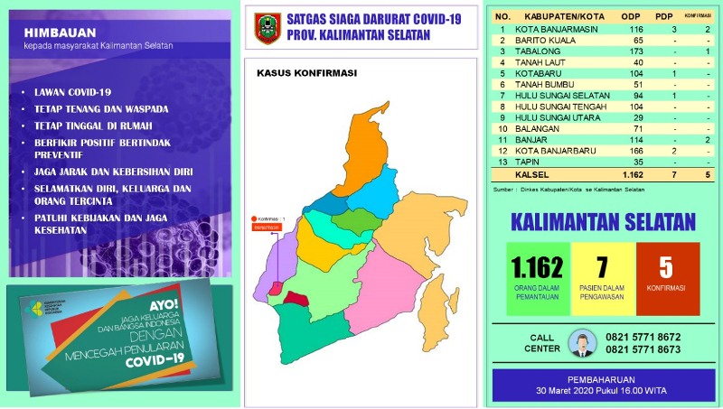 Hal itu disampaikan Juru bicara Gugus Tugas Pencegahan dan Percepatan Penanganan Covid-19 Kalsel Muhammad Muslim dalam konferensi pers melalui video di Command Center Pemprov Kalsel, Senin (30/3).