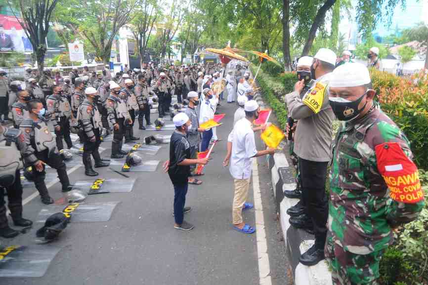 Banjarmasin, BARITO – Ratusan Anggota TNI-Polri tetap mematuhi protokol kesehatan dengan memakai masker saat menerima arahan dari pimpinan mereka setelah pengamanan demo, didepan Kantor DPRD Provinsi Kalsel, Jum’at (6/11/2020) sore