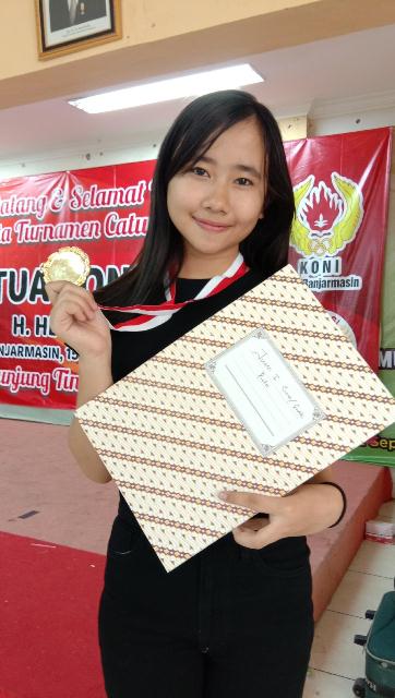 “Senang dan gembira bisa menjuarai turnamen Ketua KONI Banjarmasin Cup I ini. Semua ini menjadi motivasi untuk meraih prestasi yang lebik lagi,” sebut gadis kelahiran Bandung 6 Desember 2003 di Bandung ini.
