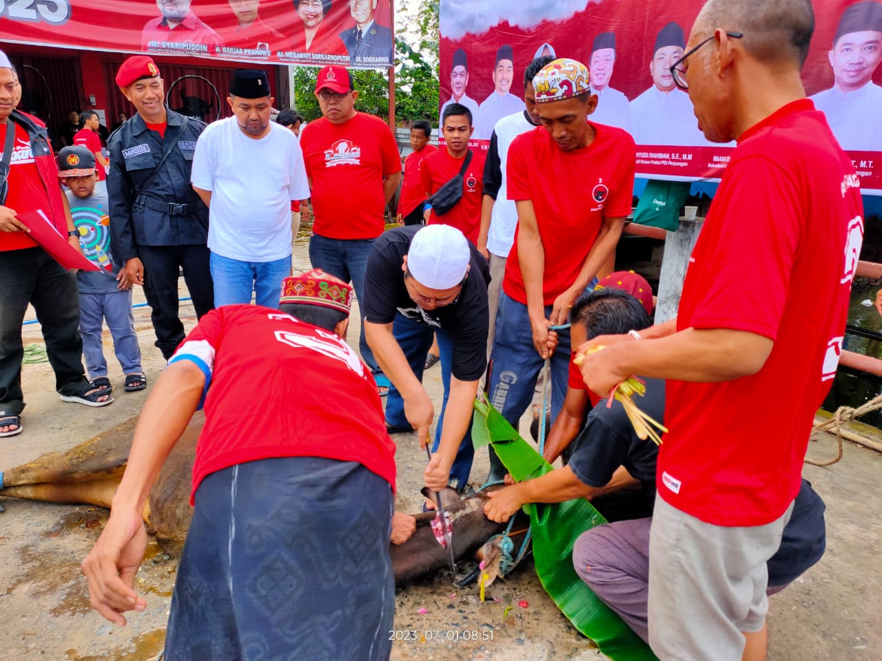 Penyembelihan hewan qurban di momen Hari Raya Idul Adha 1444 Hijriyah ini oleh Ustadz H Ilham Humaidi disaksikan Ketua DPD PDIP Provinsi Kalsel, Muhammad Syaripuddin besert pengurus, kader dan simpatisan partai berlambang Banteng moncong putih ini.