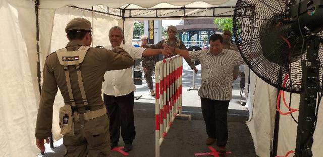 Banjarmasin, BARITO – Akses keluar masuk Balai Kota Banjarmasin sudah mulai dijaga ketat oleh petugas. Tak hanya itu, setiap pegawai maupun tamu yang ingin masuk wajib di semprot cairan disinfektan demi mencegah Covid-19, Senin (23/3). “Lewat sini pak harus disterilisasi sebelum masuk Balaikota,” ucap salah seorang petugas Satpol PP yang sedang bertugas bersama 4 rekan lainnya.