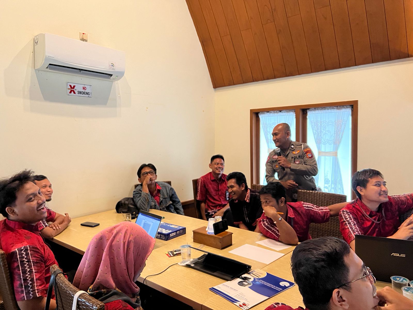 Selain Yoga Prabowo, juga hadir pemateri Aiptu Budiono dari Polresta Banjarmasin. “Kita memperkuat silaturahmi sekaligus keinginan Kementerian Komunikasi dan Informatika RI untuk mendapatkan materi keselamatan berkendara,” tutur Budiono.