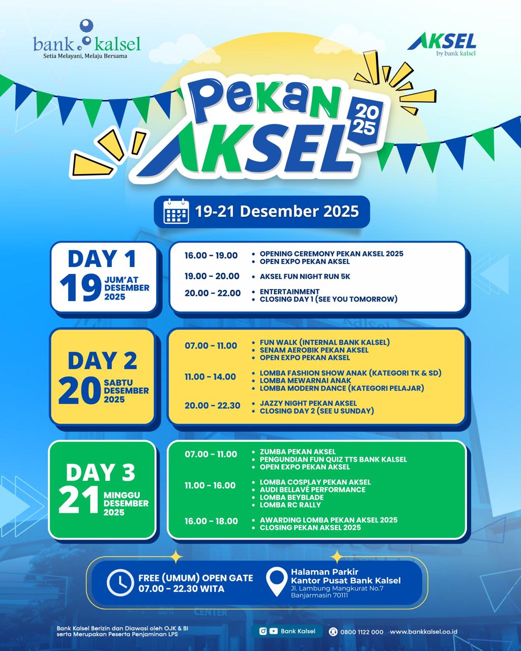 – Menutup tahun dengan semangat kolaborasi dan gaya hidup digital, Bank Kalsel akan menghadirkan Pekan AKSEL 2025 pada tanggal 19 hingga 21 Desember 2025 di Area Parkir Kantor Pusat Bank Kalsel, Jalan Lambung Mangkurat No 7, Banjarmasin. Event ini mengintegrasikan layanan perbankan digital dengan UMKM, olahraga, hobi, dan hiburan dalam satu rangkaian kegiatan untuk Masyarakat Kalimantan Selatan.