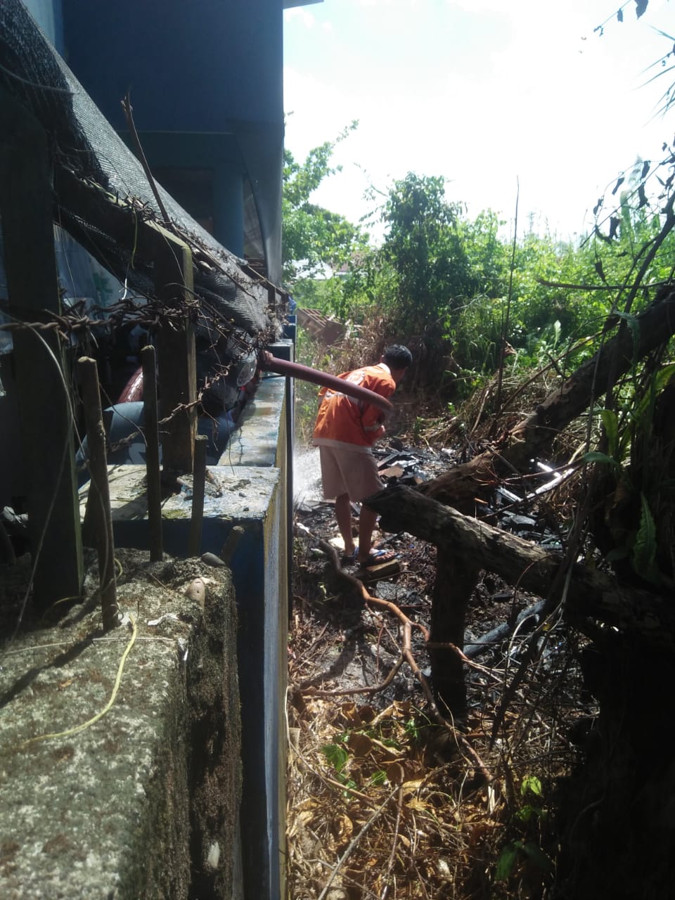 Dengan sigap petugas damkar menurunkan mesin portable dan memuntahkan semprotan air ke semak belukar yang juga ada sedikit sampah. Sementara beberapa pelajar juga turut membantu kemungkina nereka juga anggota damkar setempat.
