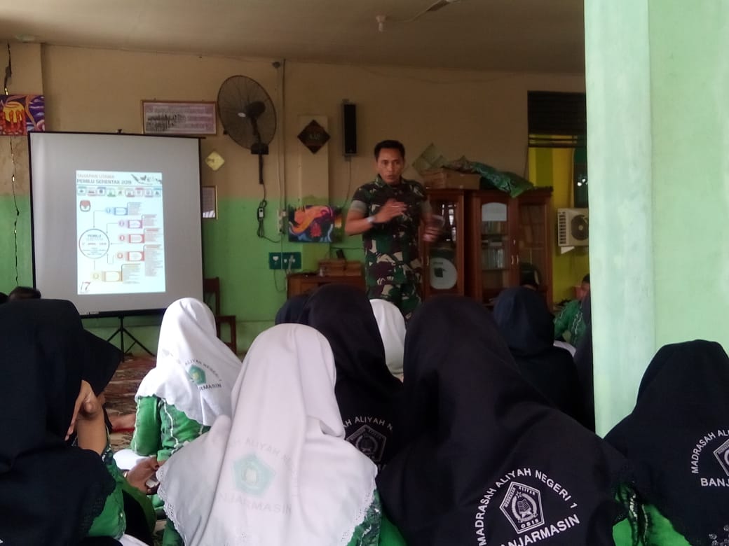 Koramil 1007-01/Banjarmasin Timur di Sekolah MAN 1 Banjarmasin, Kamis (24/1) Dalam Acara Sosialisasi Penyampaian Proses Pemilu tahun ini yang diikuti puluhan siswa dan siswi setempat.