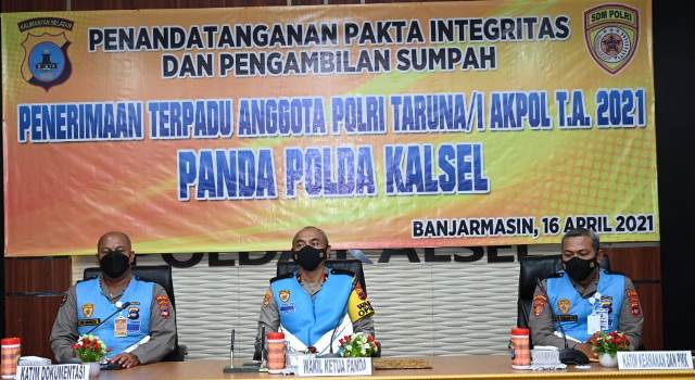 Wakapolda Kalsel Brigjen Pol Mohamad Agung Budijono, S.I.K., M.Si. memimpin langsung jalannya pembacaan sumpah dan penandatanganan pakta integritas yang diikuti oleh calon Peserta, Panitia serta Orang tua peserta, Jumat (16/4/2021) pukul 13.30 Wita di Rupatama Polda Kalsel.