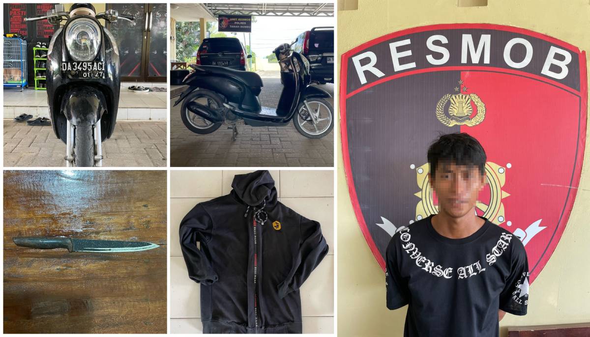 Setelah pihak Kepolisian Resort Tanbu mendapatkan laporan dan melakukan penyelidikan, dan berhasil mengamankan pelaku beserta barang bukti berupa 1 Unit Sepeda Motor Merk Honda Scoopy Berwarna Hitam dengan Nopol DA 6816 ZAW Noka MH1JFL112EK124305 Nosin JFL1E1128137 1 Lembar Jaket Berwarna Hitam 1 Bilah Pisau dengan warna gagang Coklat