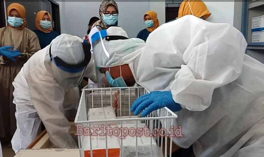 Vaksin-vaksin covid 19 itu pun langsung diarahkan menuju gudang farmasi di Dinas Kesehatan, dan oleh personil yang mengangkat kardus berisi vaksin covid 19 itu pun harus mengenakan Alat Pelindung Diri (APD). Vaksin yang sudah dibongkar dari dalam kardus selajutnya diletakan pada box penyimpanan obat pada gudang farmasi karena ada temperatur suhu yang harus disesuaikan dengan kondisi berbagai macam obat dan vaksin.