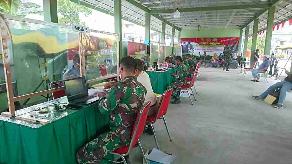 Dengan memanfaatkan tempat bangunan parkir di samping Makodim di Jalan S Parman Banjarmasin Tengah, petugas Babinsa menerapkan memasang penghalang plastik agar tidak bersentuhan langsung atau jaga jarak.