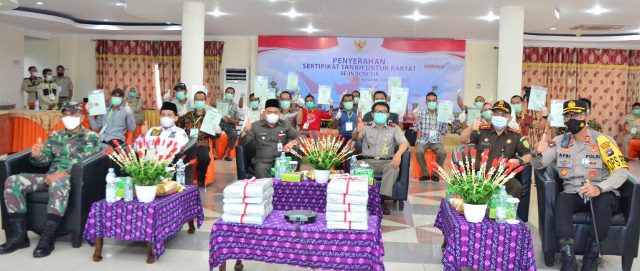 Penyerahan sertifikat tanah secara virtual untuk Kab. HSU dilaksanakan di Mess Negara Diva Kab. HSU yang dihadiri Bupati HSU Drs. H. Abdul Wahid,HK.,MM.,M.Si, Ketua DPRD HSU Almien Ashar Safari,SKM, Kapolres HSU AKBP Afri Darmawan,S.IK.,M.H, Dandim 1001 Amt/ Blg diwakili Pasi Log Kapten Inf. Eko Wibowo, Kepala Kejaksaaan Negeri Amuntai Novan Hadian,S.H, Kepala BPN HSU Chris Pius Joko Sriyanto, Wakapolres HSU Kompol Irwan,S.ST.,S.H dan beberapa orang perwakilan dari sejumlah 412 Penerima Sertifikat Tanah wilayah Kab. HSU