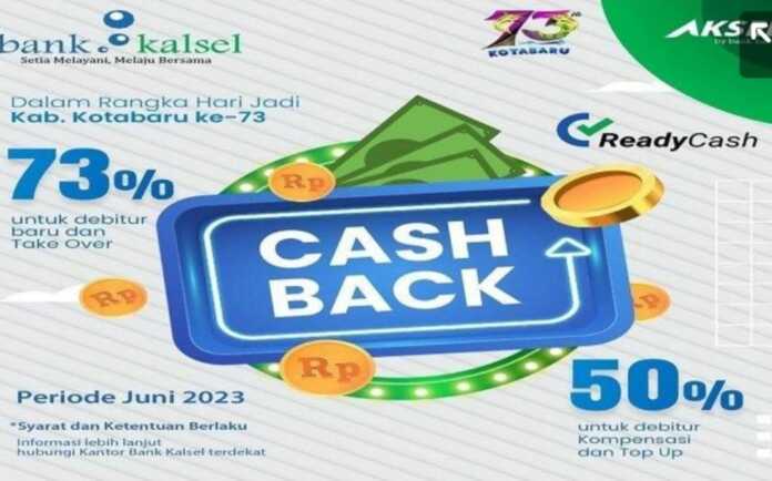 Dalam rangka Hari Jadi ke-73 Kabupaten Kotabaru, ditawarkan promo Cashback 50 persen untuk debitur dan kompensasi top up. Bahkan, tak tanggung, Bank Kalsel memberikan Cashback besar-besaran.