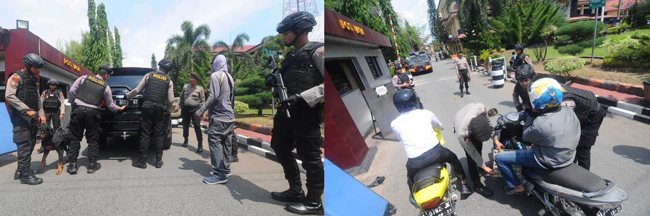 Sejumlah personel menjaga masing-masing pintu masuk dan keluar secara ketat. Sementara beberapa polisi bersenjata lainnya menyebar di berbagai sudut Mapolda Kalsel. Tak hanya itu Polda Kalsel juga menerjunkan anjing terlatih yang tergabung dalam pasukan khusus Unit K9 . Anjing anjing yang dikendalikan masing masing satu anggota Polisi itu mengendus endus setiap ada mobil tamu atau motor yang masuk Mako