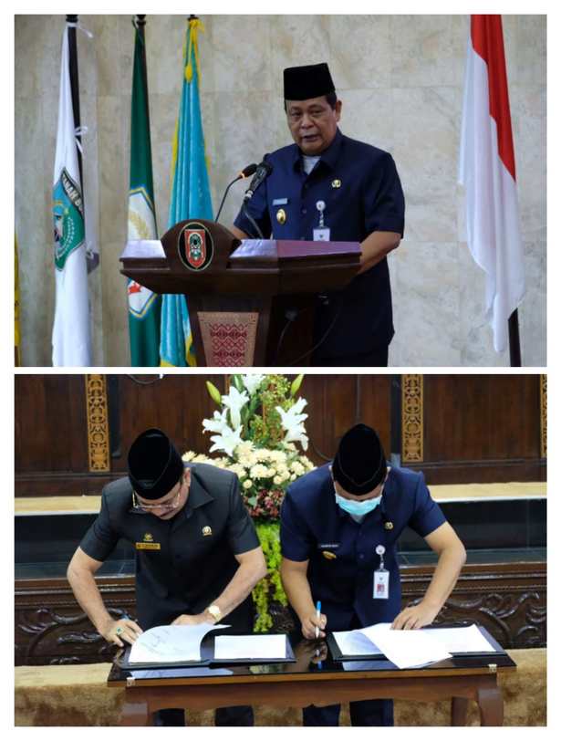 Dalam sambutannya gubernur juga menyampaikan gambaran umum Rancangan Perubahan APBD Tahun Anggaran 2020, sebagaimana telah kami sampaikan dokumennya pada hari ini adalah sebagai berikut Pendapatan Daerah dianggarankan sebesar Rp6.656.475.428.911 turun sebesar Rp574.429.735.089 atau 7,94 persen dari Anggaran Murni Tahun 2020 sebesar Rp7.230.905.164.000. Kemudian Belanja Daerah dianggarkan sebesar Rp7.047.518.382.972 turun sebesar Rp533.386.781.028 atau 7,04 persen dari Anggaran Murni Tahun 2020 sebesar Rp7.580.905.164.000 dan selisih antara Pendapatan Daerah dan Belanja Daerah terdapat Defisit yang ditutupi dengan Pembiayaan Netto sebesar Rp391.042.954.061 nail sebesar Rp41.042.954.061 atau 11,73 persen dari Anggaran Murni Tahun 2020 sebesar Rp350.000.000.000.