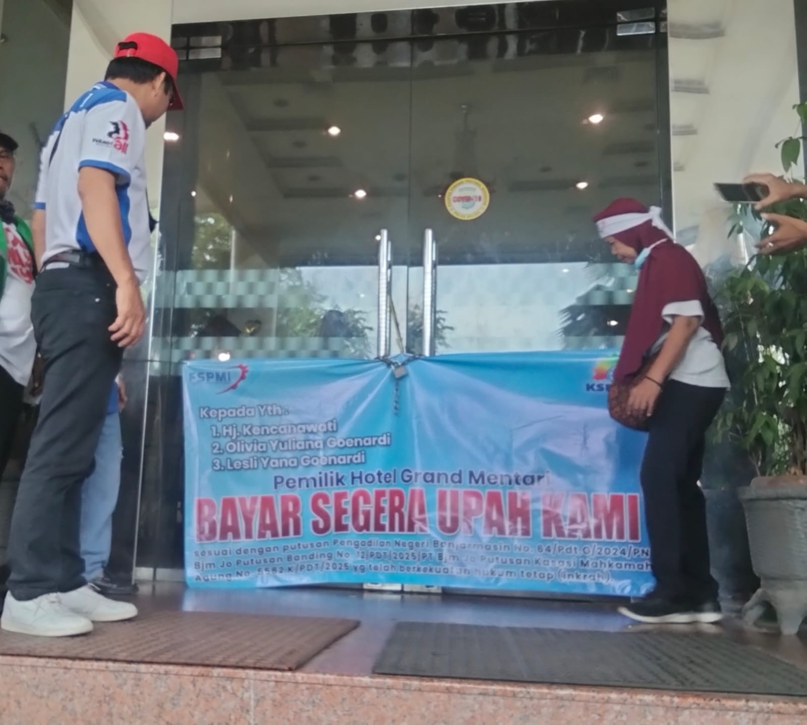 Sekitar 20 orang eks pegawai hotel yang berlokasi di Jalan Lambung Mangkurat, Kota Banjarmasin, melakukan aksi penyegelan dengan menggembok pintu utama hotel, Sabtu (3/1/2026).