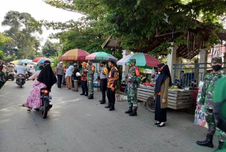 Personil Polres Hulu Sungai Tengah (HST) Polda Kalsel bersama Polsek Labuan Amas Selatan (LAS), Koramil 1002-04/Pantai Hambawang, BPBD Kabupaten HST dan Petugas Kecamatan melaksanakan Sosialisasi Peraturan Bupati (Perbup) No.34 Tahun 2020 tentang Penerapan Disiplin dan Penegakan Hukum Protokol Kesehatan sebagai upaya pencegahan dan pengendalian Corona Virus Disease 2019 (Covid-19) di Pasar Mingguan Pantai Hambawang, Selasa (8/09/2020).