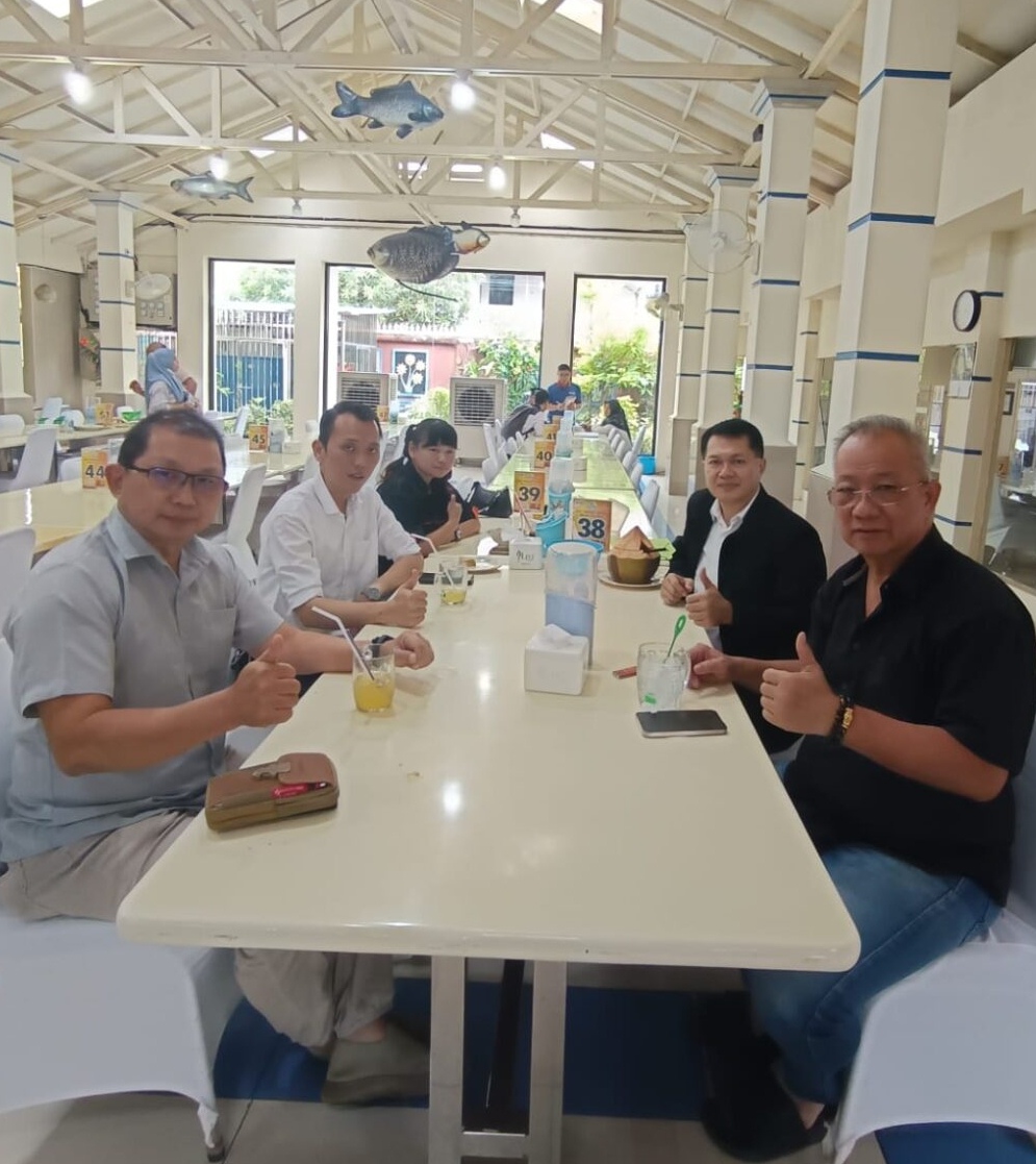 Sekretaris Geman Yusuf, SH., MH; Bendahara Djohan Djawonoe, SH; Direktur Pendidikan Dr. Muljadi, S.Kom., MM., MBA; dan Koordinator Kepala Sekolah Andri Kristianto, S.Kom., menikmati hidangan andalan Depot Sari Patin, patin bakar khas Banjar.
