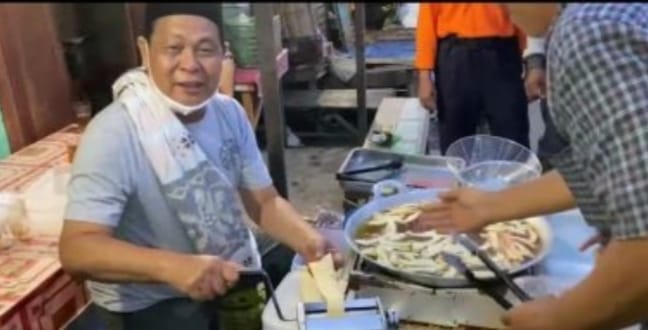 Setelah berkeliling melihat-lihat kondisi pasar, Paman Birin mampir ke tempat pedagang pisang molen yang sedang sibuk membuat kue tersebut.