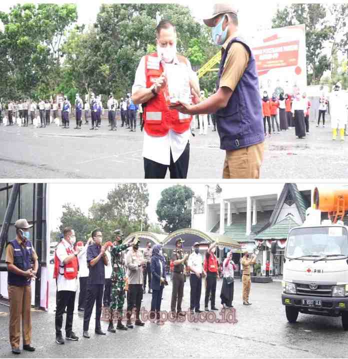 Sebelum melakukan penyemprotan, oleh Bupati Tala H.Sukamta, Ketua PMI Kalsel H.Gusti Iskandar Sukma Alamsyah,ketua PMI Tala Syahrian Nurdin, ketua DPRD Tala, Forkopimda Tala serta kepala SKPD melepasanya dihalaman Stadion Pertasi Kencana Pelaihari, plus dilakukan apel kesiapan pencegahan covid 19.